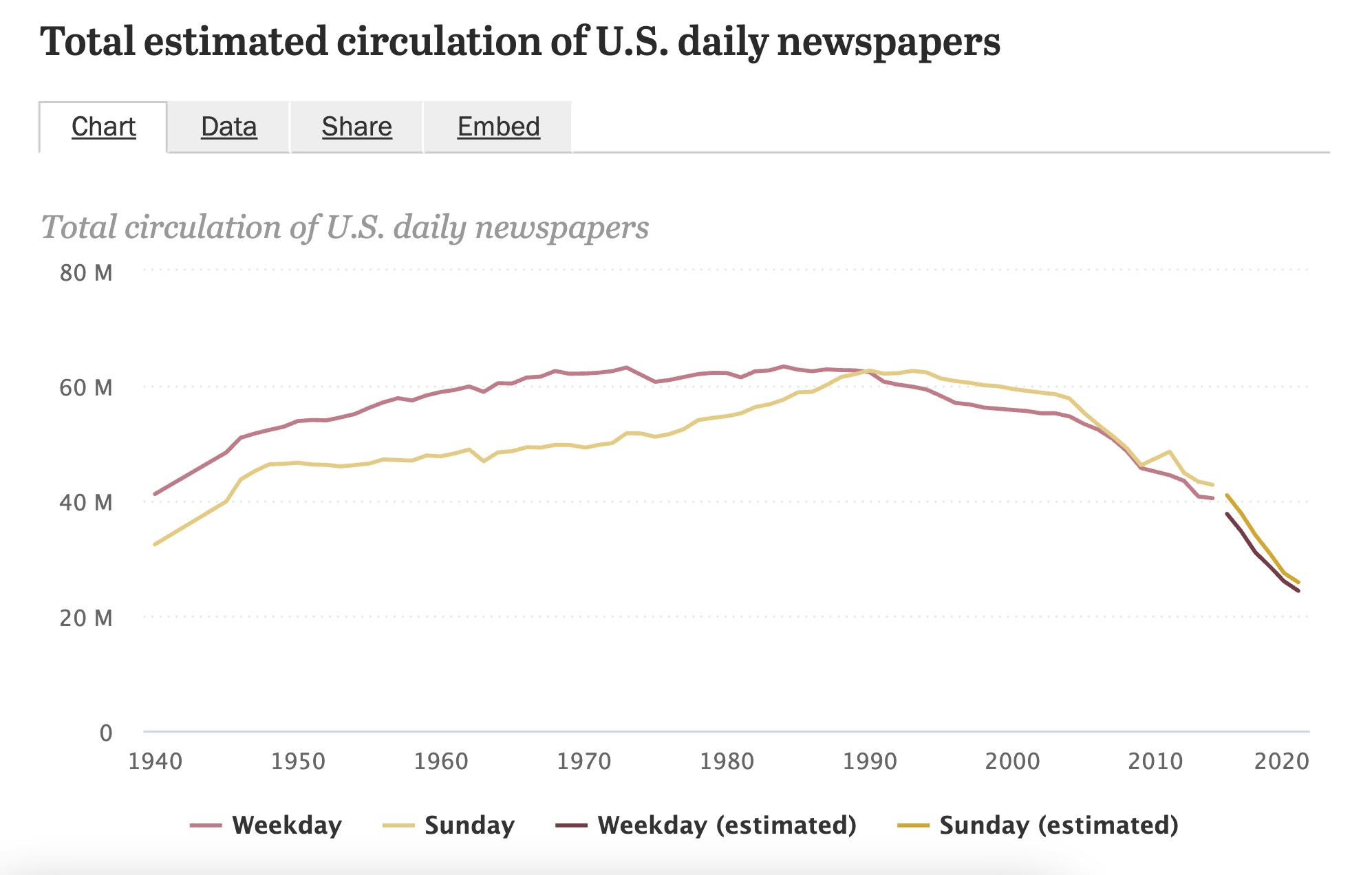 In 2008, weekday newspapers had a circulation of 48,597,000. By 2018, that dropped to just 28,554,137 per these estimates, a 41% decline.