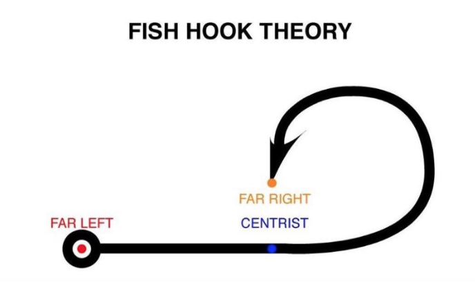Online leftists jokingly dismiss “horseshoe theory” with “fishhook theory,” an illustration of how the right, in refusing to compromise, drags mass perception of where the middle is over their way.